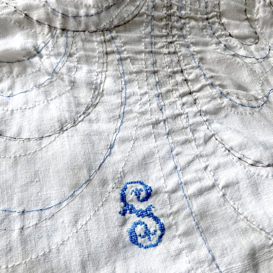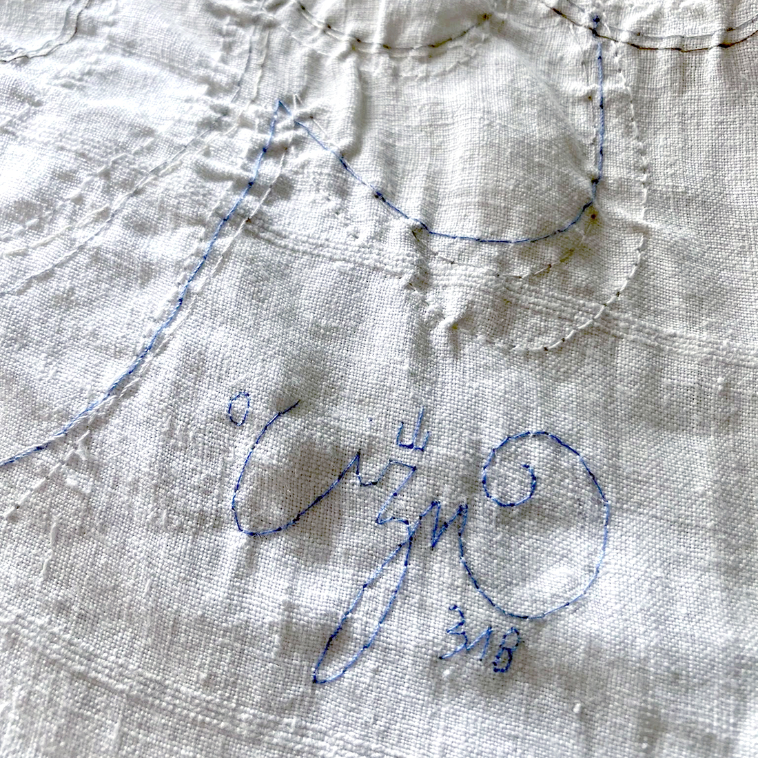 Pillowcase created in March 2018, hand-sewn and embroidered on both sides, made from a large linen towel once part of a family trousseau.
