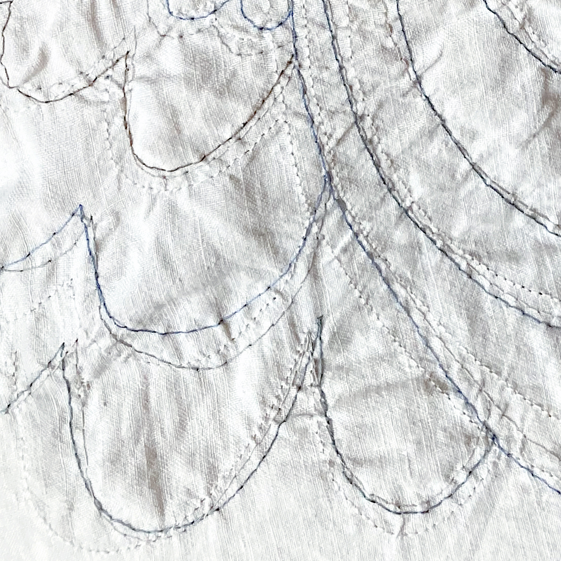 The embroidery, made with three overlapping threads set slightly apart, shifts in visibility depending on the light, creating a sense of movement, depth, and stratification—like an echo, a reverberation.