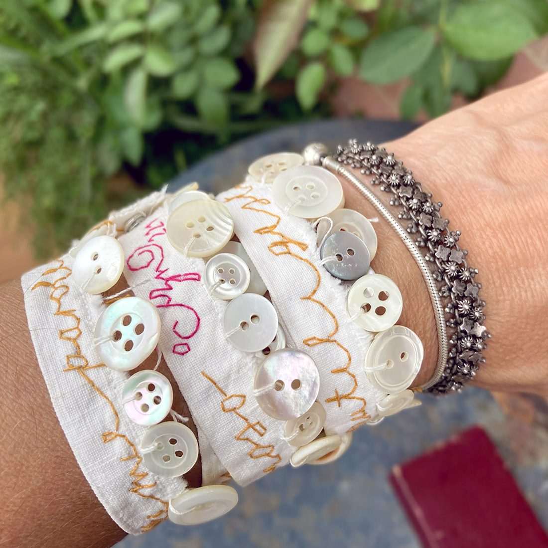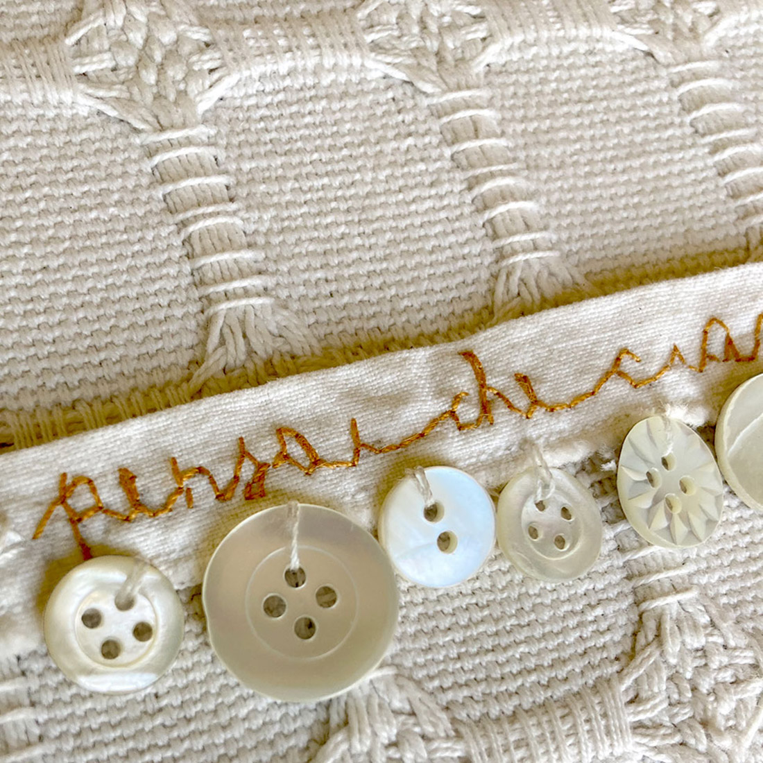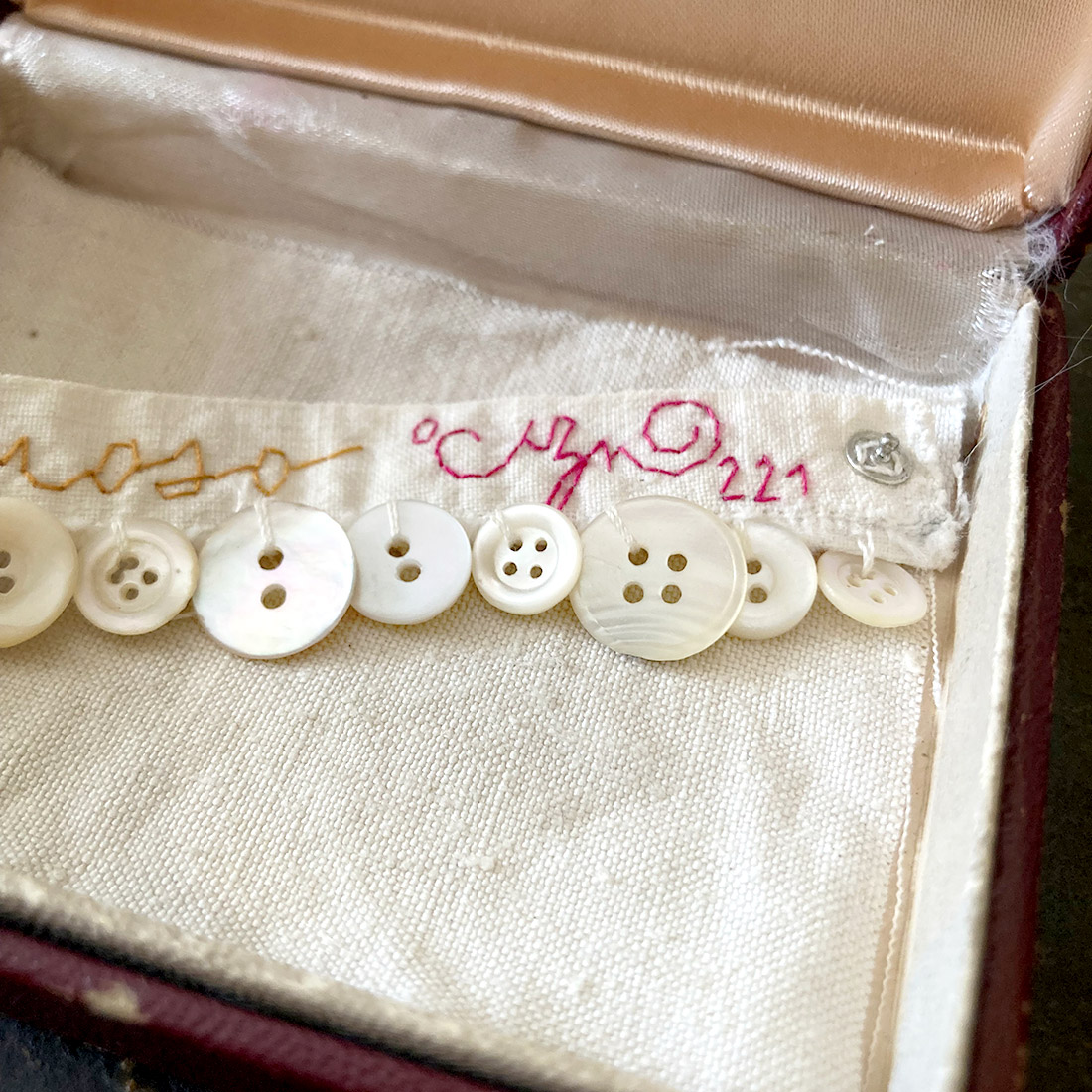 The act of embroidery itself turns words into something immanent, almost eternal. The mother-of-pearl buttons stitched along the tape amplify this permanence, obsessively echoing the cyclic nature of time—a reminder to choose words with care.