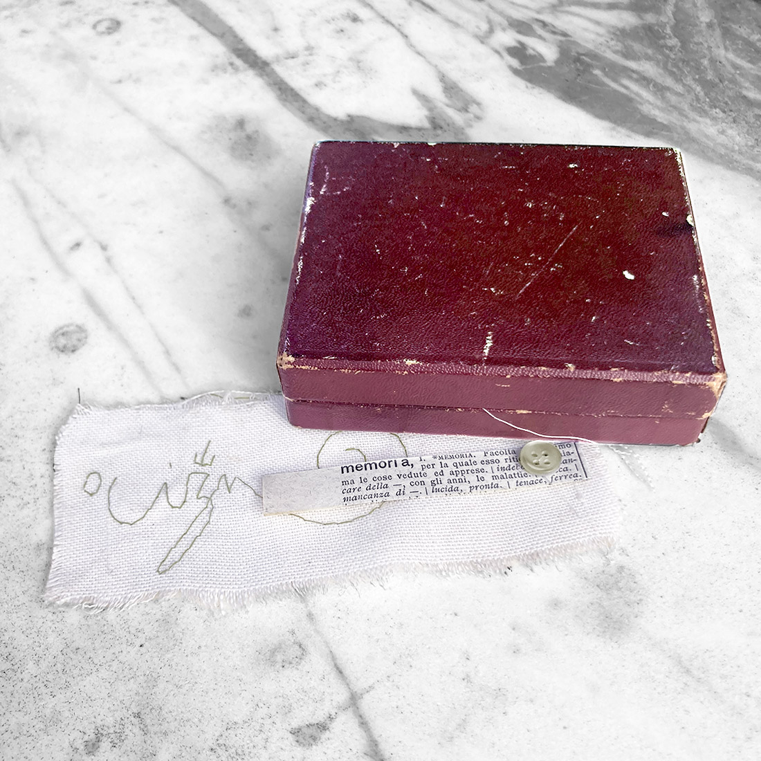 A phrase embroidered on the selvage of a vintage cotton sheet, drawn from Borges’ story Funes the Memorious. It is spoken by the narrator, struck by the awareness that every word of his conversation with the protagonist will remain forever engraved in memory, as if carved in stone.