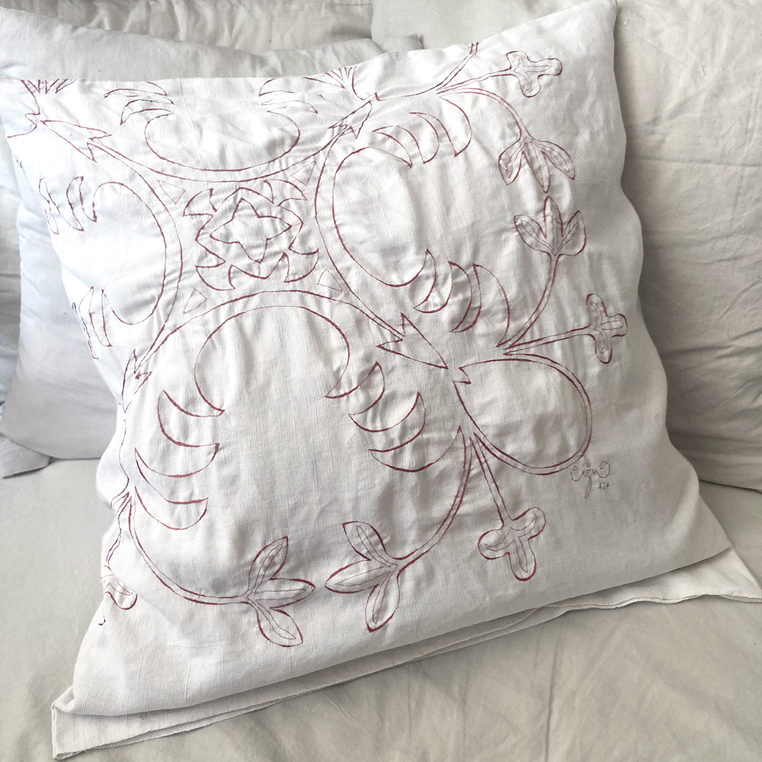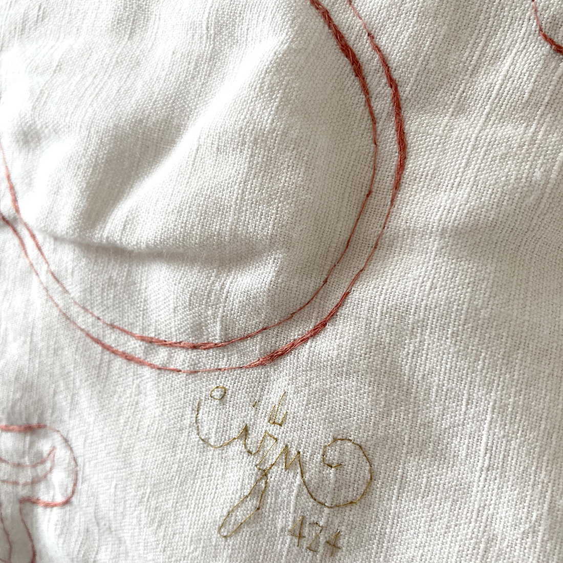 Cucita e ricamata a mano sul davanti con filo di cotone vintage, questa federa racconta un paesaggio emotivo attraverso un gesto lento e intuitivo, una mappa che nasce dal corpo e dalla memoria.