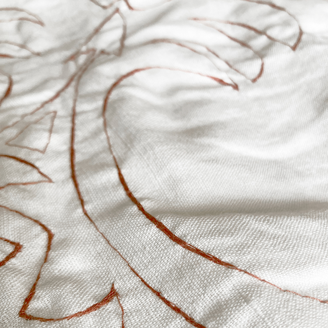 Il filo rosso ne segue i contorni con ostinazione leggera, come a voler trattenere una memoria geometrica, fatta di foglie, punte, corolle astratte. La trasformazione di un frammento del passato in qualcosa da toccare, abitare, riprendere tra le mani.