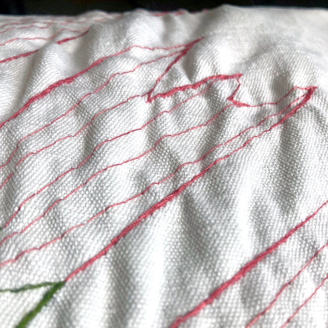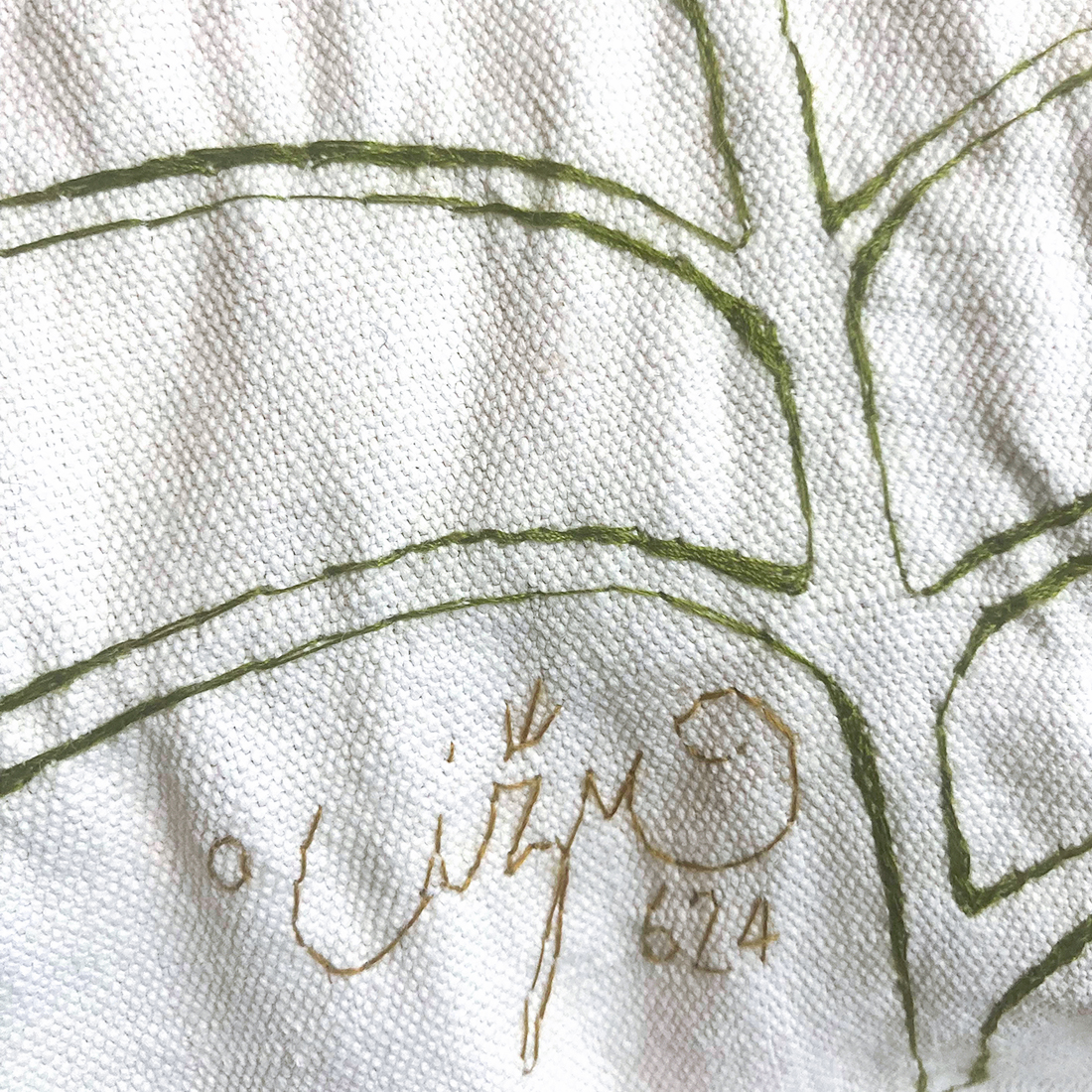 Il ricamo è eseguito a mano, sul davanti, con filo di cotone vintage. Ogni punto racconta una storia silenziosa, ogni cucitura è un gesto che tiene insieme memoria, corpo e cura.