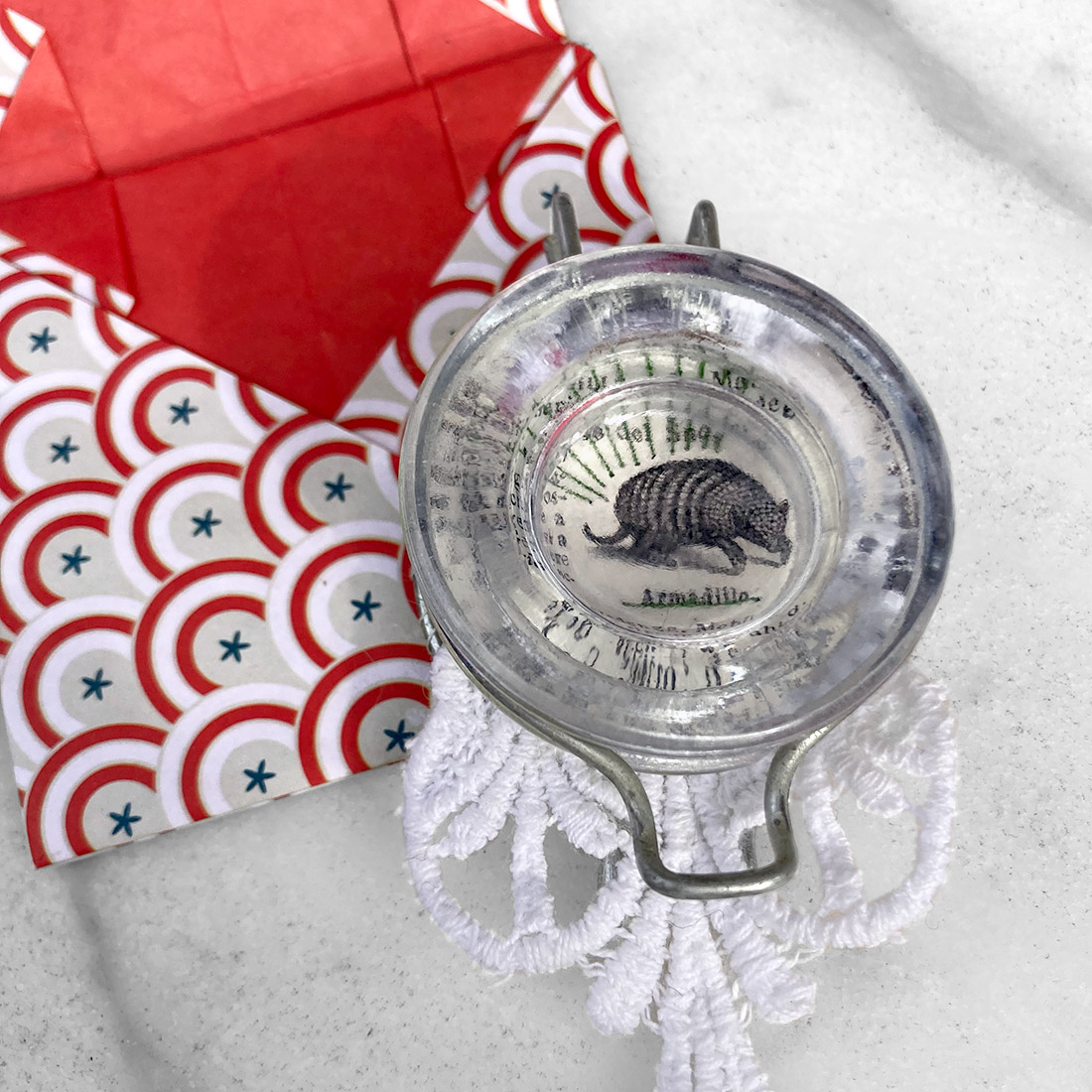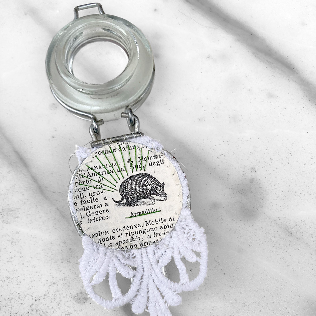 Amuleto indossabile ottenuto dal coperchio di un piccolo barattolo di vetro, riconvertito in un medaglione apribile. Sotto il vetro appare l’immagine di un armadillo, ritagliata dalla pagina di un vecchio vocabolario Zingarelli, e ricamata a mano. L’oggetto può essere portato come spilla, applicata a un indumento, oppure come ciondolo, appeso al collo con un nastrino o una catenina.