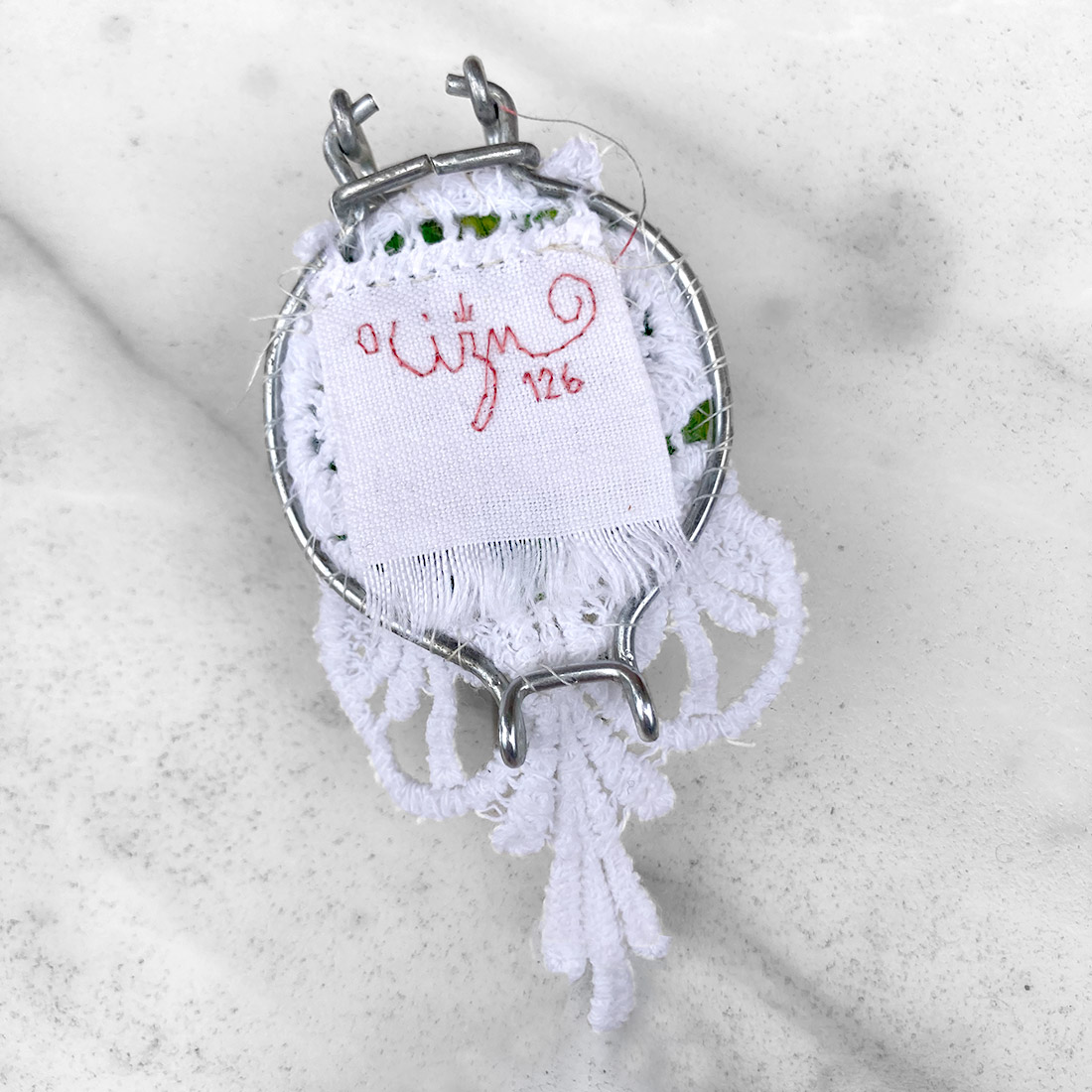 Sul retro è cucito un ritaglio di merletto di cotone vintage, su cui sono cuciti un frammento di pagina di vocabolario e la firma dell’artista, ricamata a mano su lino. La costruzione avviene interamente attraverso gesti manuali, senza passaggi seriali, rendendo ogni talismano irripetibile.