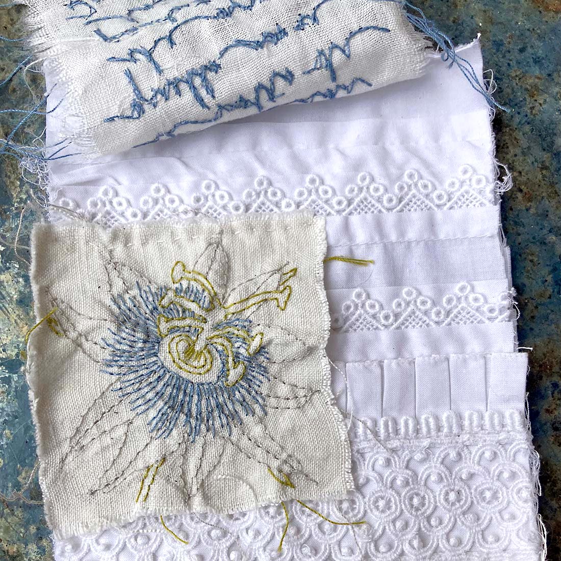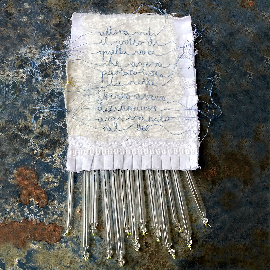 “I miei sogni sono come la vostra veglia” fa parte della serie Reperti temporali, in cui ogni frammento cucito rappresenta una memoria interiore, conservata in forma fisica. Il processo creativo si sviluppa partendo da oggetti trovati, tessuti vissuti e suggestioni autobiografiche. Ognuno di questi lavori è unico e non ripetibile.