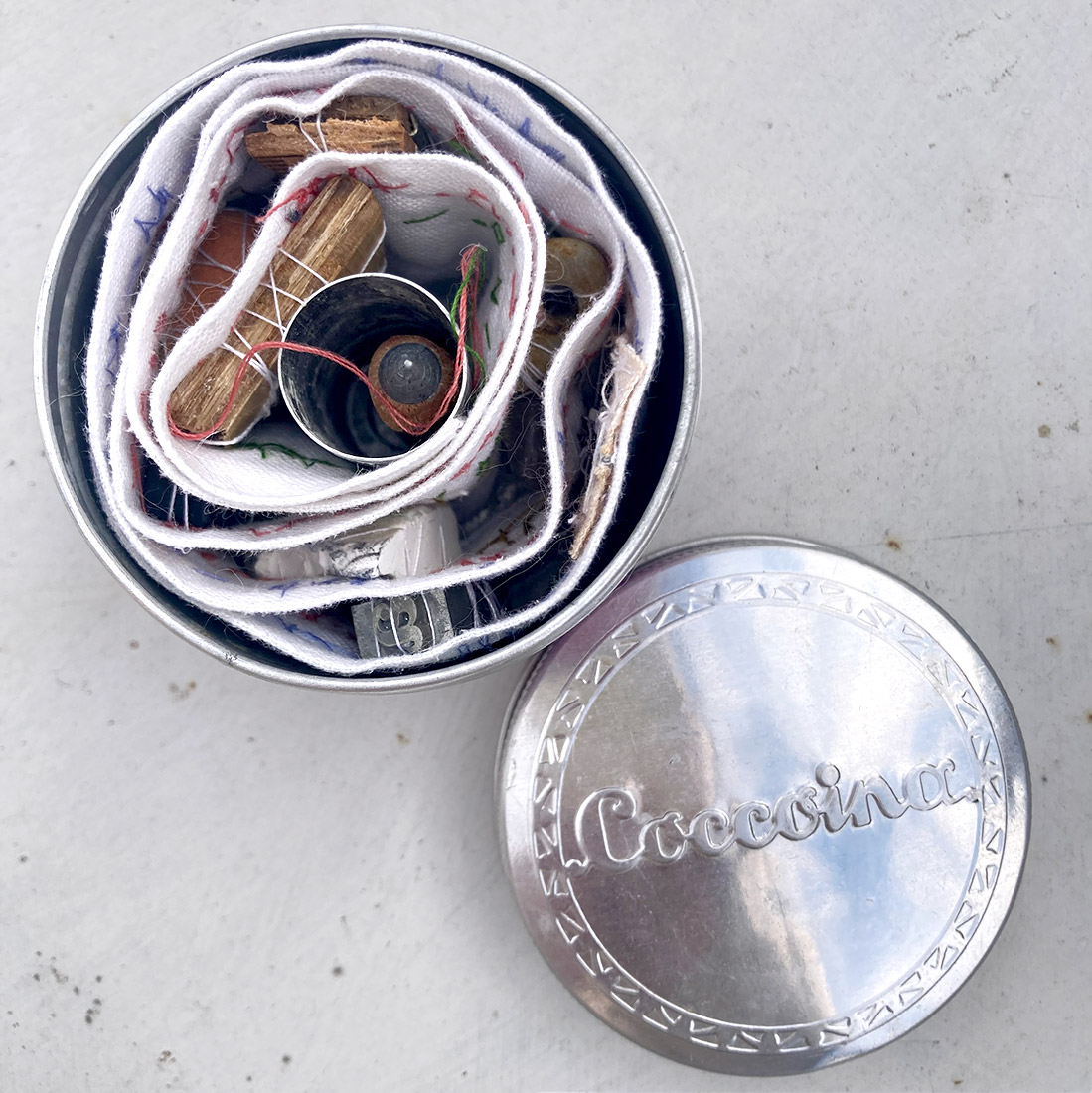 Talismano in un barattolo di colla Coccoina che custodisce una striscia di stoffa ricamata e piccoli oggetti legati al lavoro manuale. Un omaggio alla memoria delle mani e alla bellezza dei gesti che sanno creare e tramandare.