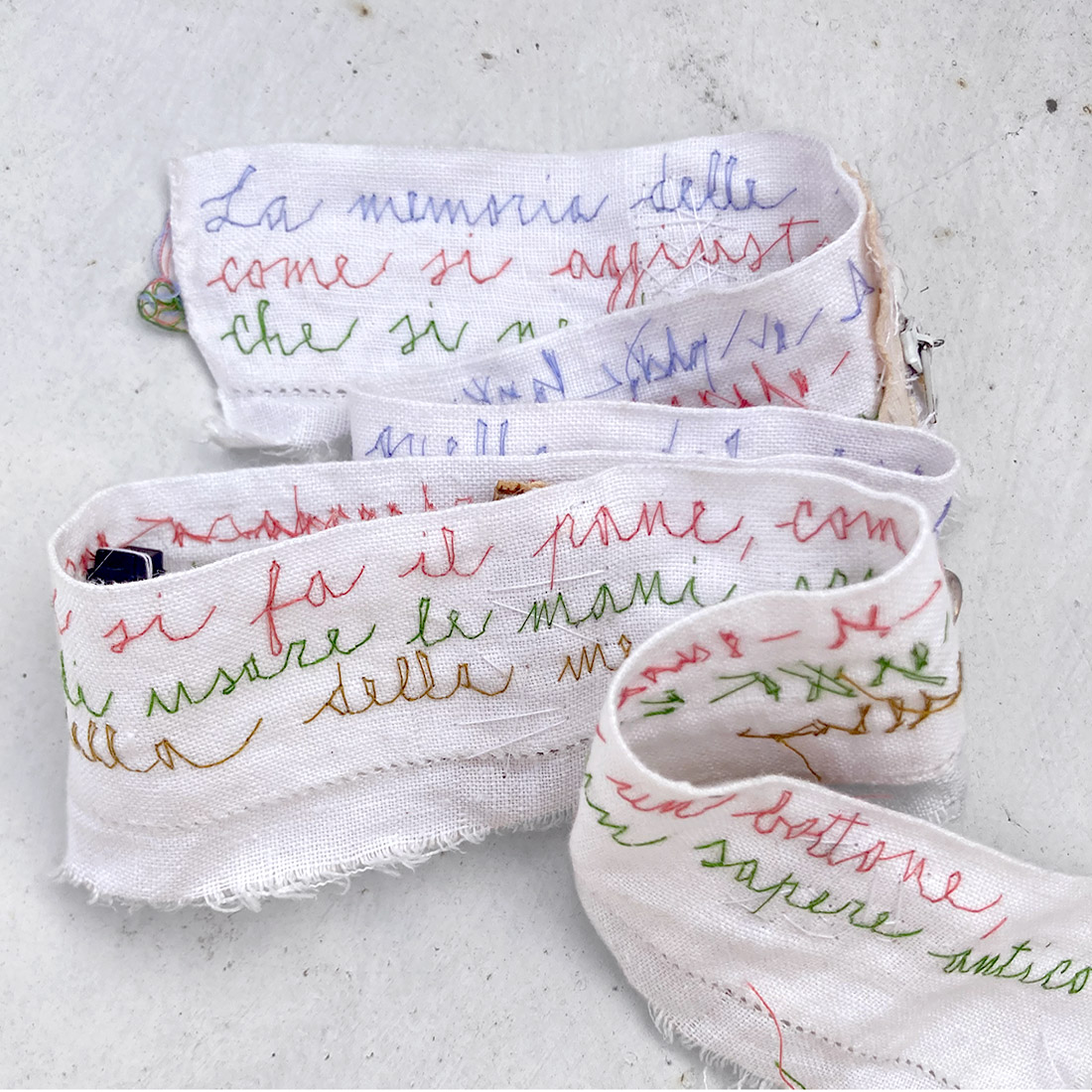 All’interno del barattolo su una lunga striscia di cotone ricavata da un vecchio lenzuolo è ricamata una frase ispirata agli scritti di Natalia Ginzburg: La memoria delle mani è più forte di quella del cuore. Le mani ricordano come si fa il pane, come si cuce un bottone, come si aggiusta un giocattolo o si accende una fiamma. Non dimentichiamo di usare le mani; ogni gesto è un sapere antico che si perde se non lo esercitiamo. La memoria delle mani rimane quando quella della mente vacilla.