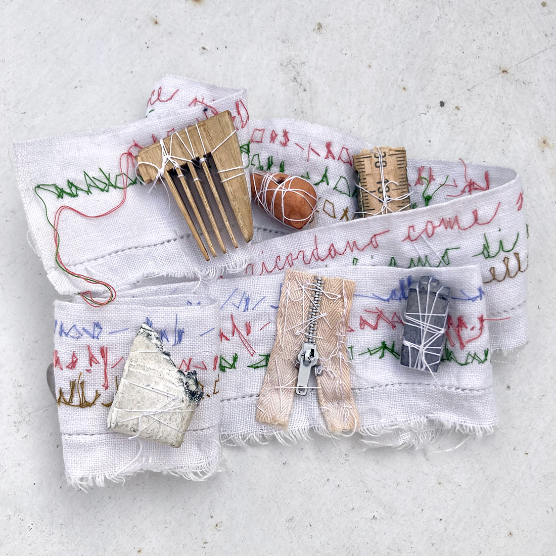 Sul retro del tessuto, come piccole reliquie del fare, sono cuciti oggetti che evocano la manualità. Un frammento di pettine di legno, un fischietto d’argilla fatto a mano, il portamine di un compasso, una mano di legno che stringe una pietra rosa, un pezzo di gomma pane, una parte di metro da falegname, una lettera tipografica in piombo e una cerniera di stoffa e metallo.