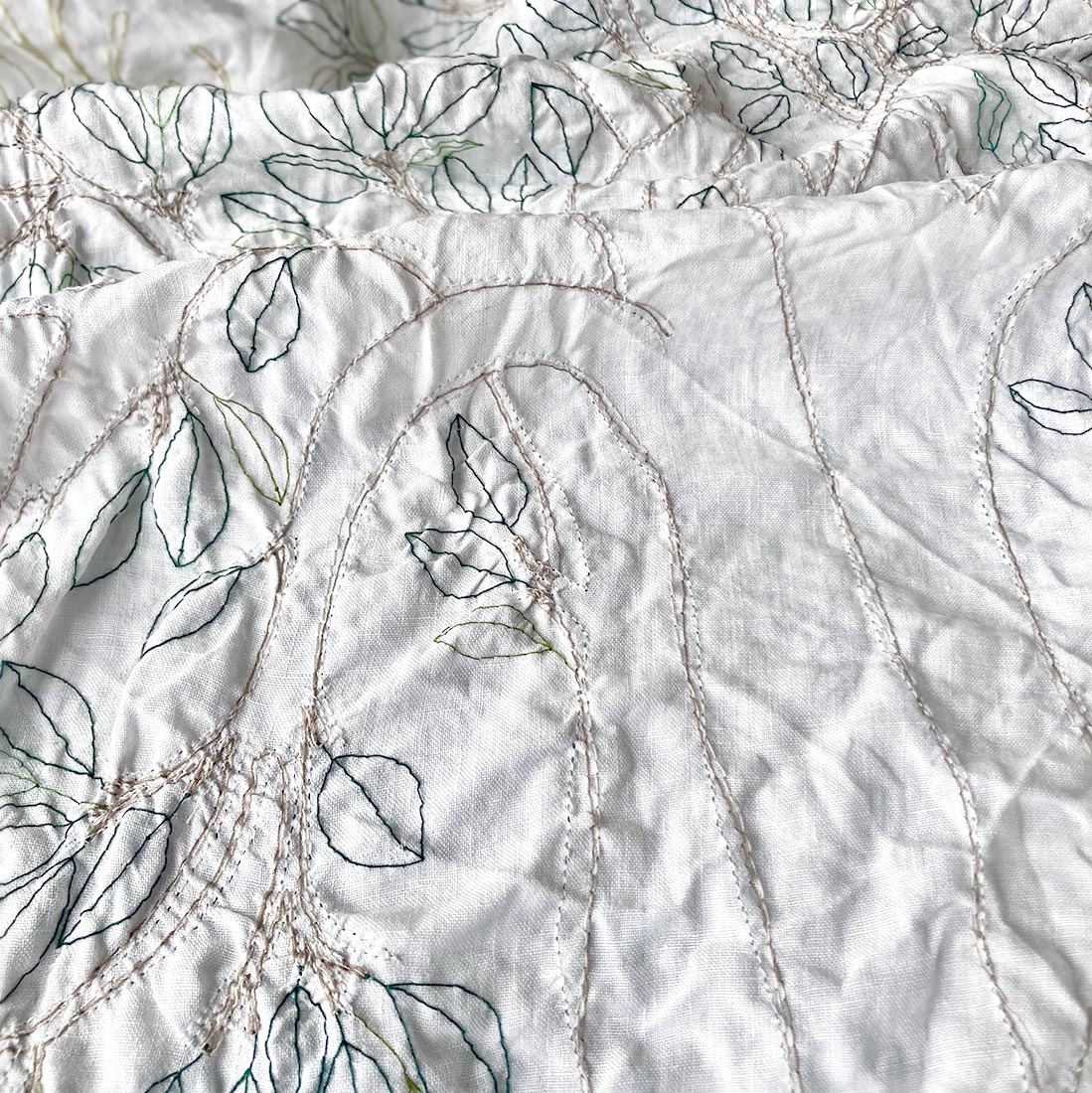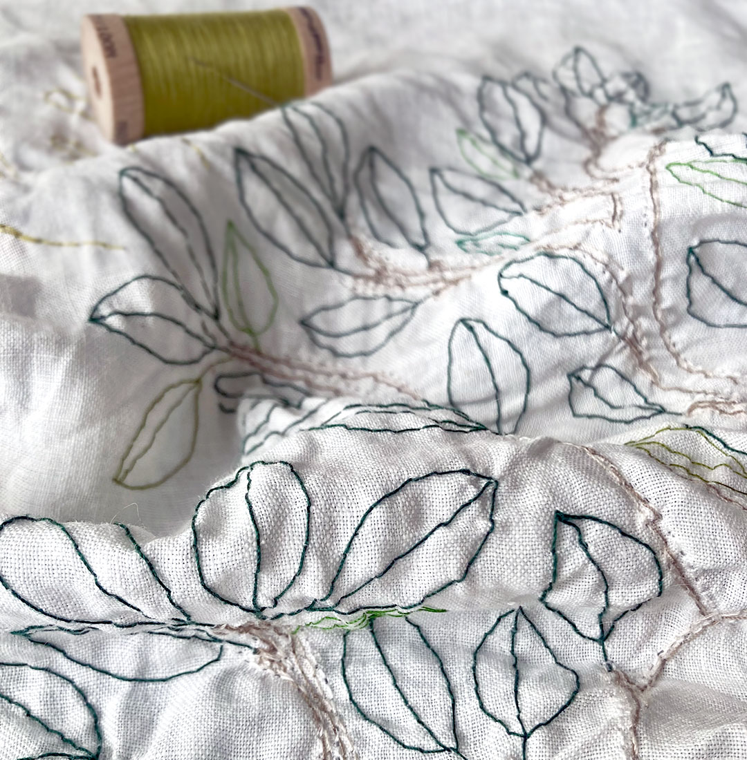 “Geografie del nido” prosegue così la sua narrazione di tessili autobiografici, oggetti che intrecciano memoria, gesto e natura. Ogni pezzo è unico, ricamato a mano su canapa antica, custode di una storia e di una luce.