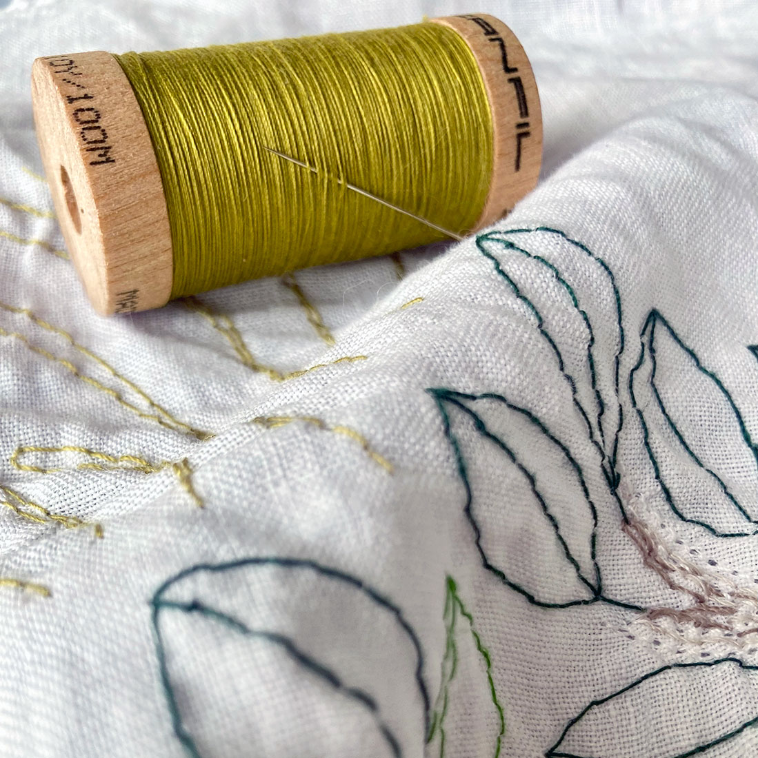 Un albero luminoso si espande su una tovaglietta di lino ritagliata dal lenzuolo di un vecchio corredo, irradiando energia. Il ricamo, realizzato a mano, racconta la forza della natura che consola e rinnova. Tra le radici e le foglie, un intreccio di luce e memoria invita a ritrovare quiete, equilibrio e speranza.