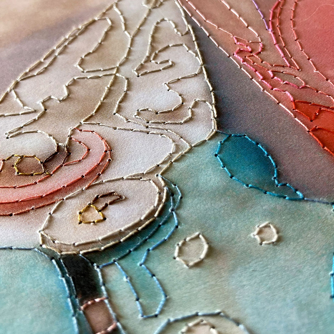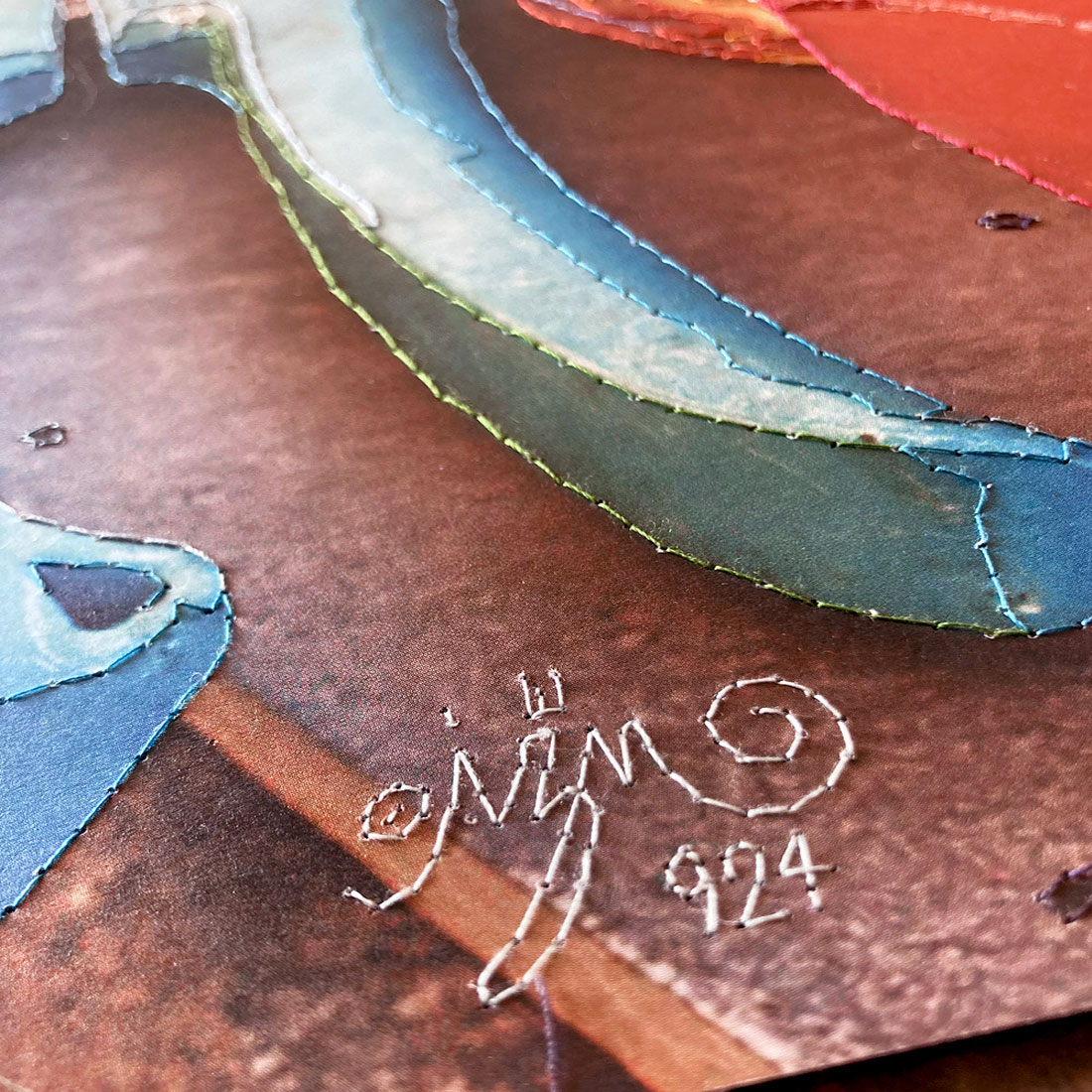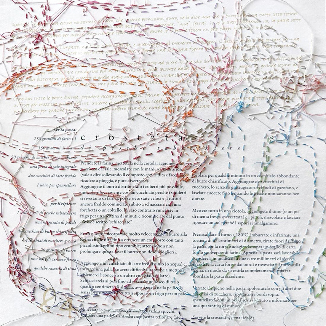 Le pagine singole, staccate da una seconda copia del libro, assumono una forza autonoma. Diventano reperti poetici, frammenti intimi che emancipati dalla linearità del testo originario si offrono come nuove mappe visive ed emotive. Ogni ricamo sottolinea e insieme trasfigura le immagini stampate: forbici, bicchieri, ingredienti quotidiani diventano segni vibranti, rilievi tattili, frammenti autobiografici.