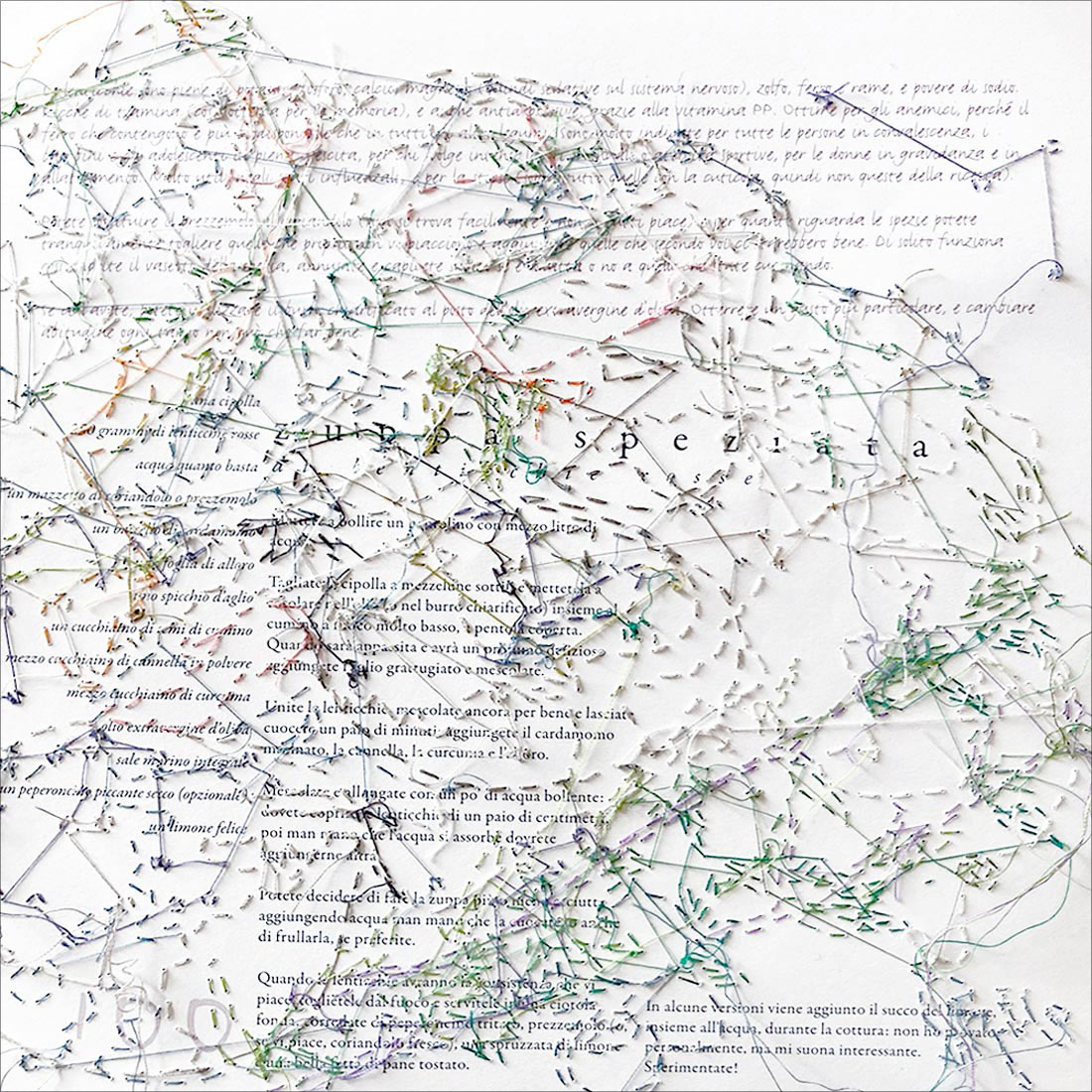Realizzata nel gennaio 2024, questa pagina è uno spin-off di un progetto radicale che trasforma il libro Cucina Consapevole in un’opera tessile contemporanea, Food Punk. Ogni foglio del volume è stato ricamato interamente a mano, in un gesto lento e ripetuto che trasforma la parola in materia e il pensiero in tessitura.