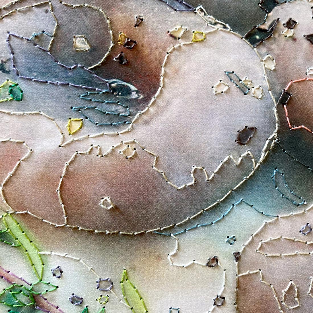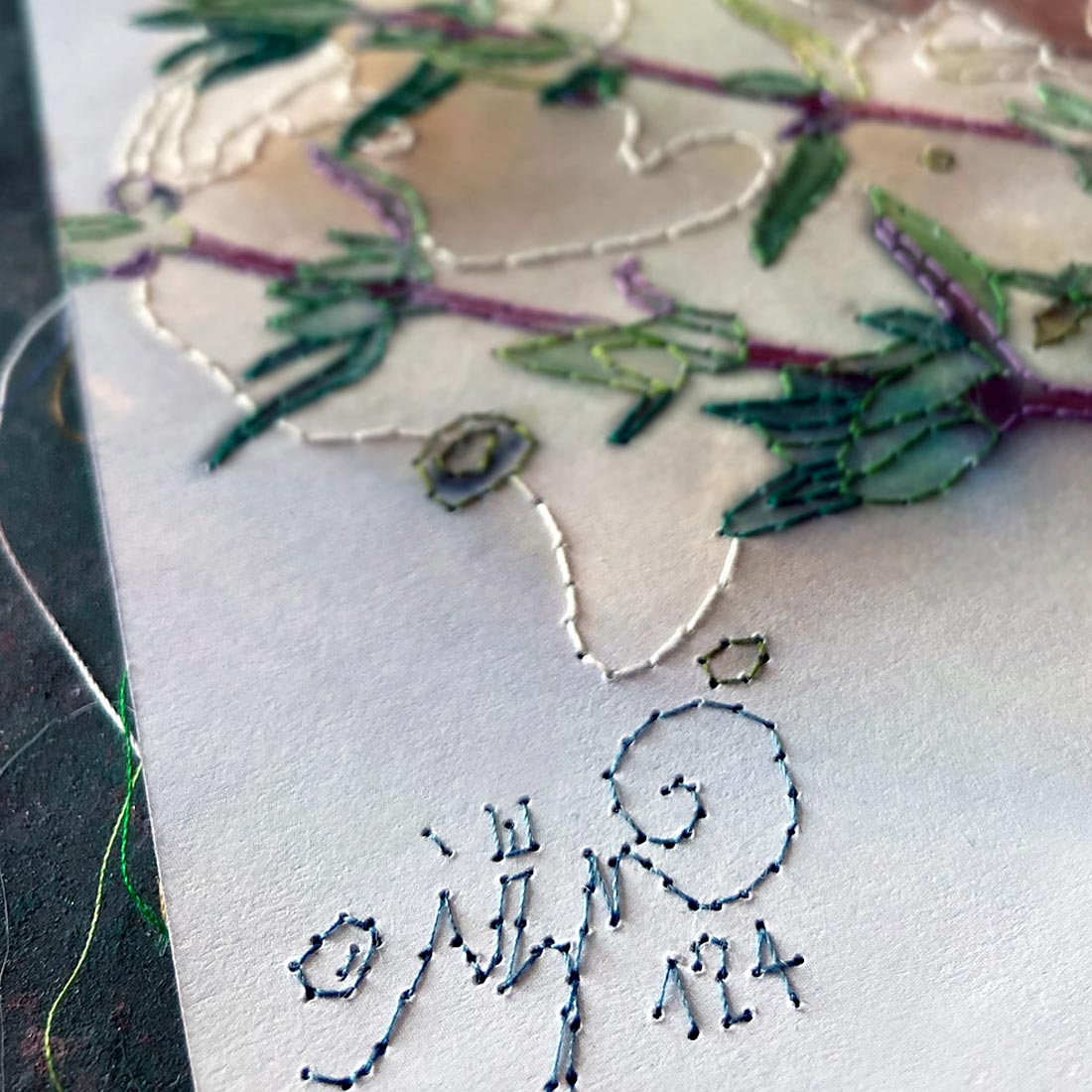 Le pagine singole, staccate da una seconda copia del libro, assumono una forza autonoma. Diventano reperti poetici, frammenti intimi che, liberati dalla linearità del testo, si offrono come nuove mappe visive ed emotive. In questa pagina, lo scatto fotografico di un piatto pronto per essere consumato viene trasfigurata dal ricamo. I contorni diventano rilievo, il colore si fa materia, l’immagine si trasforma in un paesaggio emotivo e in memoria cucita.