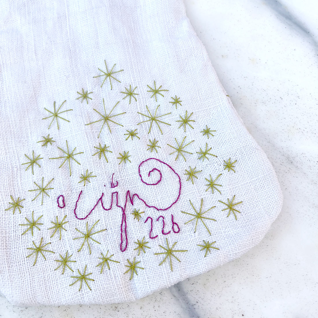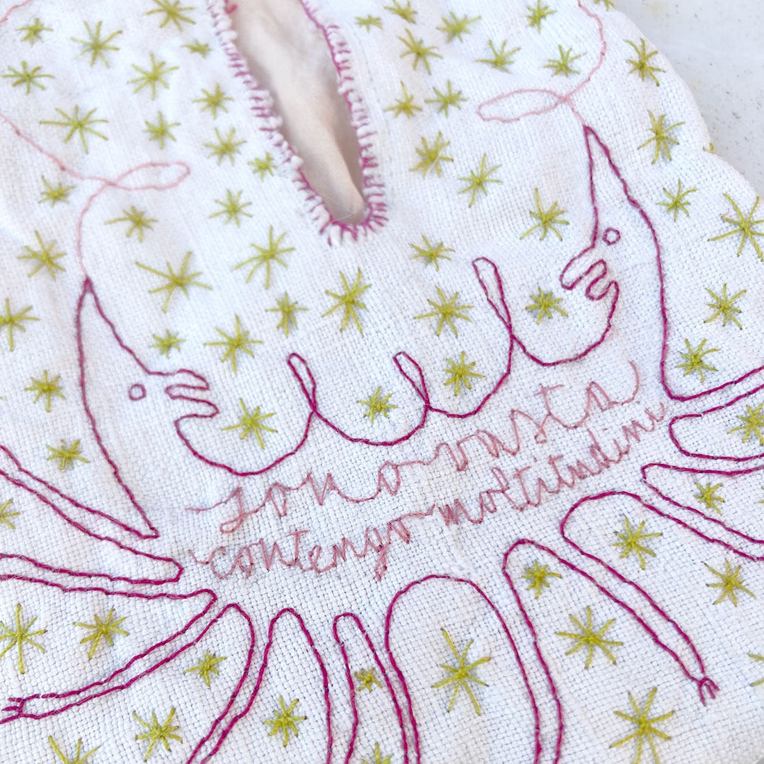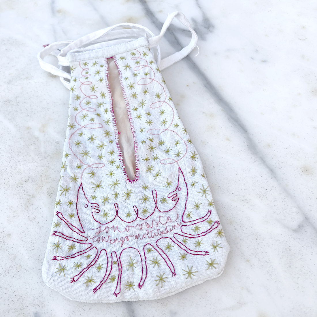 Realizzata in lino e ricamata a mano, la tasca può essere annodata alla vita con la sua fettuccia. Sulla parte anteriore è ricamato un lupo a due teste, figura unitaria e bifronte. Sul corpo dell’animale compare la frase “sono vasta, contengo moltitudini”, verso di Walt Whitman tratto da Canto di me stesso nella raccolta Foglie d’erba. La citazione introduce il tema della molteplicità come condizione naturale dell’identità.