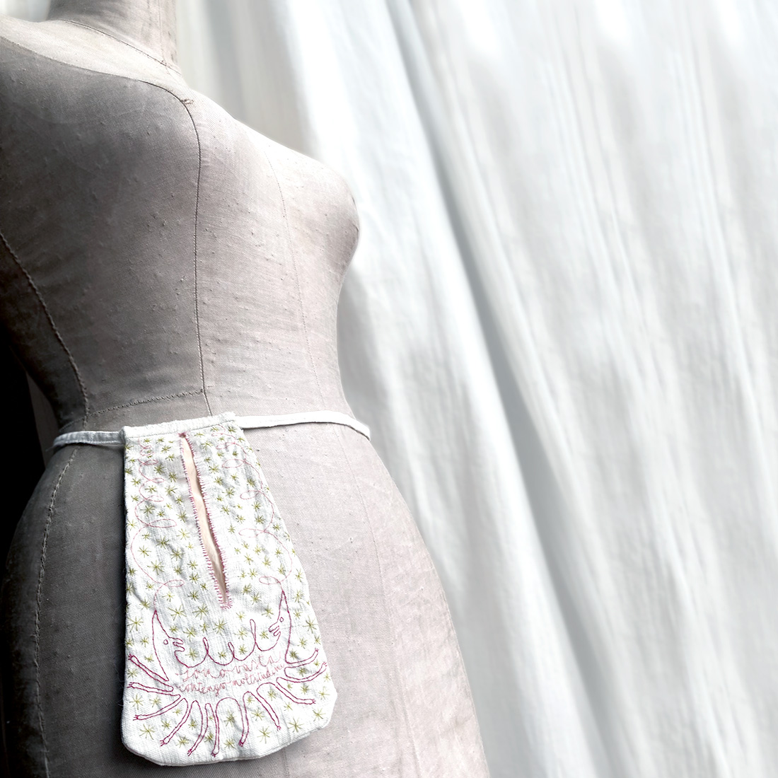 Tasca ispirata ai modelli diffusi tra Seicento e Ottocento in Europa e America, quando le donne indossavano tasche separate legate in vita e nascoste sotto gli abiti. Questo oggetto riprende quella struttura storica trasformandola in un minimo territorio mobile contemporaneo, indossabile sopra o sotto gli indumenti.