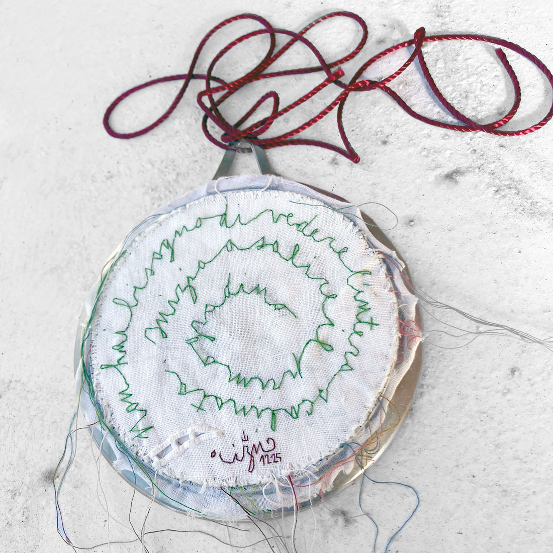 Medaglione circolare con un ricamo a mano di una fotografia in bianco e nero di un’antica scala altoatesina, cucita sul supporto di un colino in metallo. Sul retro un tessuto di lino vintage con ricamata la frase: “Non hai bisogno di vedere l’intera scalinata, inizia a salire il primo gradino”. Il talismano ha un cordoncino rosso per indossarlo.