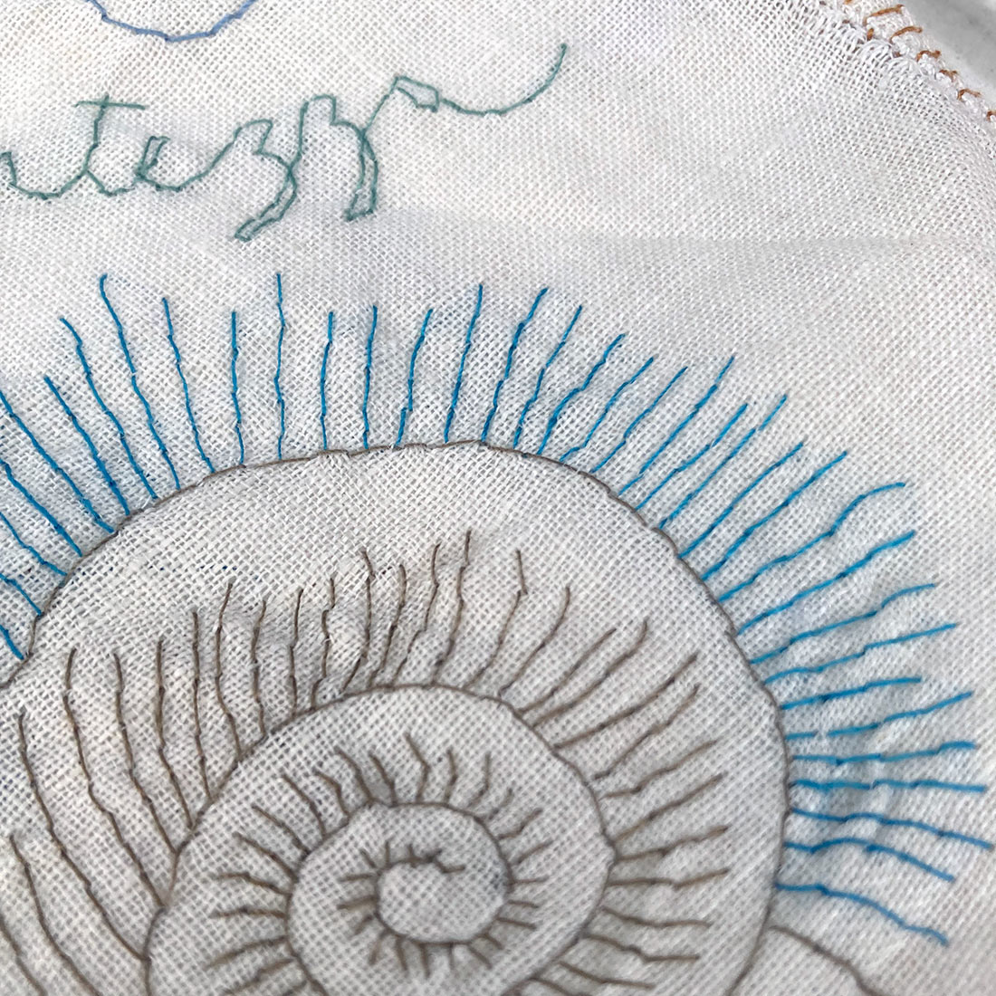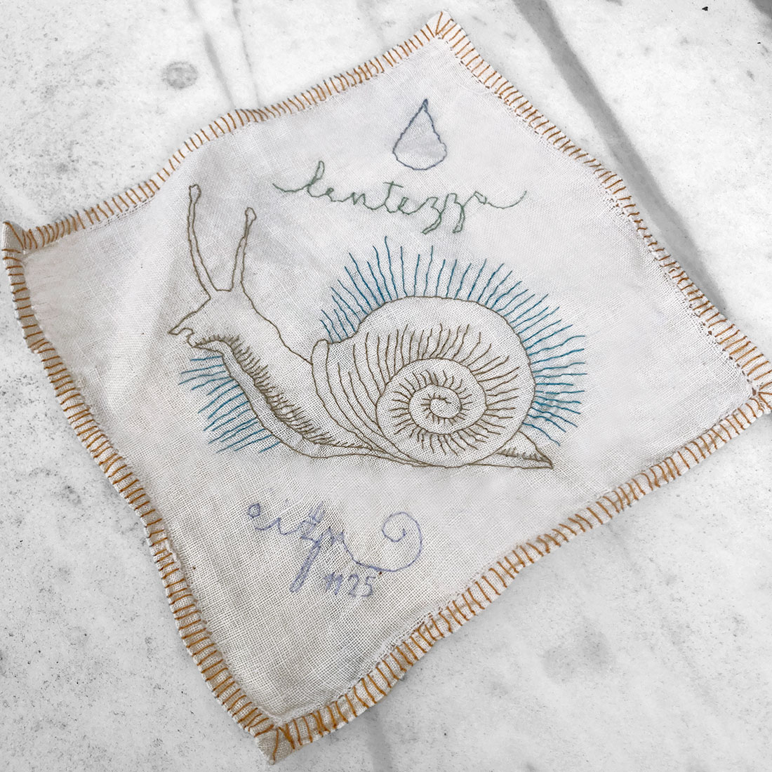 Dentro una provetta di vetro chiusa da un tappo di sughero è custodito un piccolo fazzoletto di lino ricamato a mano. Sul tessuto è ricamata una lumaca, scelta come simbolo della lentezza e del procedere senza fretta. Intorno al suo corpo si diramano sottili raggi azzurri; una traccia visiva che richiama un ritmo più calmo, una distanza diversa dal tempo che scorre. Sopra la figura è ricamata la parola lentezza, accompagnata da una goccia stilizzata che suggerisce una dose da assumere quando la vita accelera troppo e si perde il senso del proprio passo.