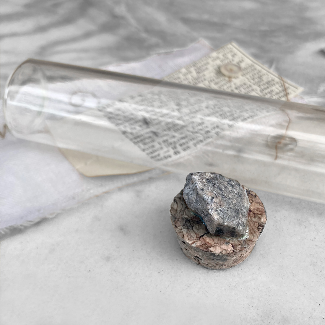Sul tappo di sughero è fissata una piccola pietra grigia: un frammento di terra, di materia solida e stabile. È un simbolo di pesantezza buona, a ricordare che ogni passo può essere più posato, più consapevole. La presenza della lumaca, lenta ma costante, dialoga con questo elemento, creando un equilibrio tra movimento minimo e presenza luminosa.